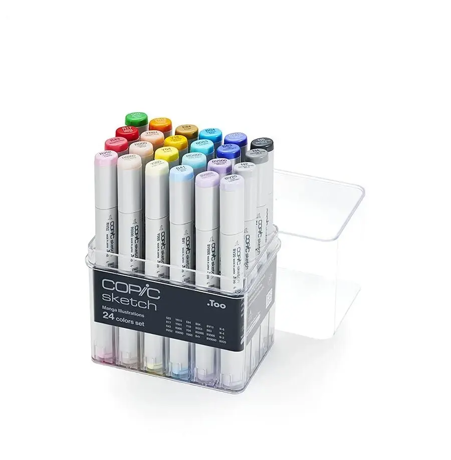 The Copic Sketch Markers Manga Wallet B 24pc Set is a favorite among artists for its versatile brush and chisel tips, making it ideal for both detailed sketches and broader applications. Users appreciate the quality of the markers, though some mention that the price may be a consideration for beginners.